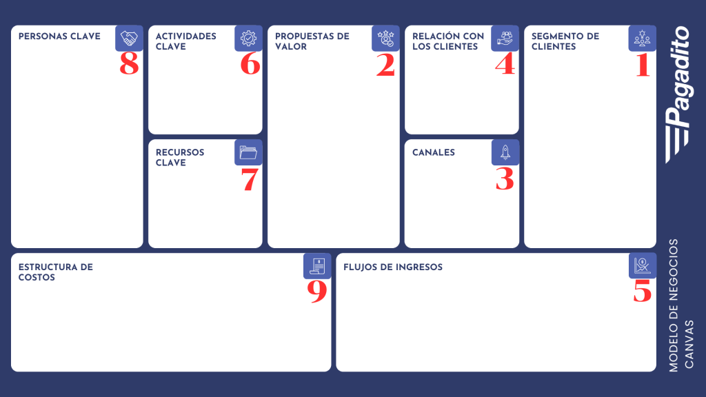 Para ayudarte a estructurar y visualizar tu modelo de negocios, hemos adjuntado un modelo de negocios. Es una herramienta práctica que te permite delinear cada uno de los elementos clave de tu modelo de negocios en un formato visual y fácil de seguir. Te recomendamos imprimir o utilizar una versión digital para completar cada sección mientras trabajas en tu plan de negocio.